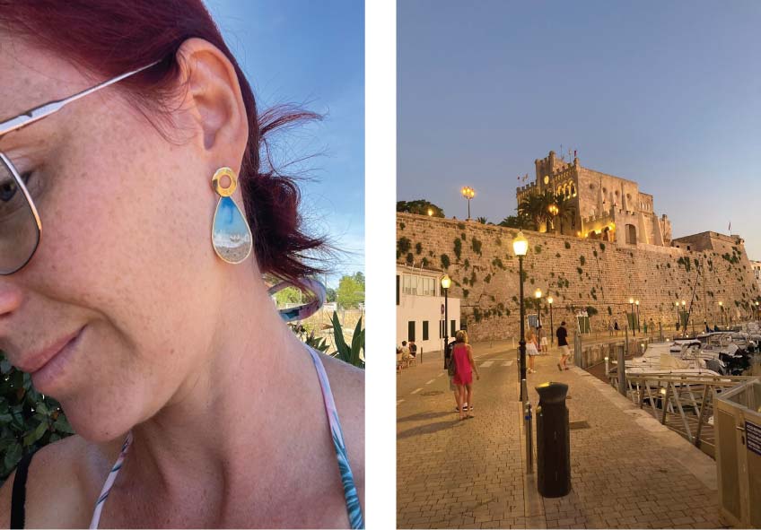 Nous avons été ravis de découvrir le marché nocturne du vendredi soir. Et j’ai retrouvé pour mon plus grand bonheur la créatrice @mdmar.joyas (Instagram). Je l’avais vu à Mao notre 1er jour, et j’avais adoré sa façon de capturer la beauté des plages minorquines pour en faire des boucles d’oreilles, colliers, bracelets… Un peu de sable, de peinture, de résine, beaucoup de patience, de talent et un peu de magie ! Créatrice moi-même de bijoux, je suis fan de son travail. J’ai donc naturellement ramené un peu de son talent dans mon sac à dos !